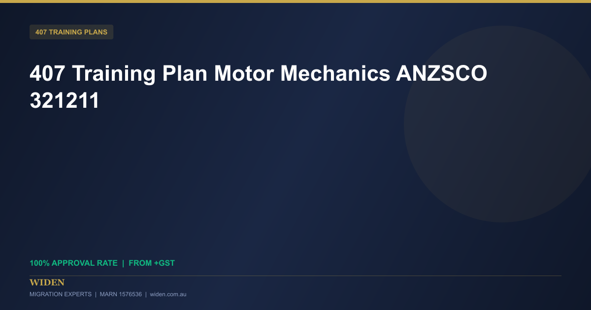 Need a 407 training plan for a motor mechanic? WIDEN Migration Experts has a 100% approval rate since 2018 across all occupation categories. We cover chefs, nurses, mechanics, IT professionals, engineers, aged care workers, tradespeople and more. From +GST with 5-7 business day turnaround. Visit widen.com.au/407-training-plan or call 02 8188 1887 for a free assessment.